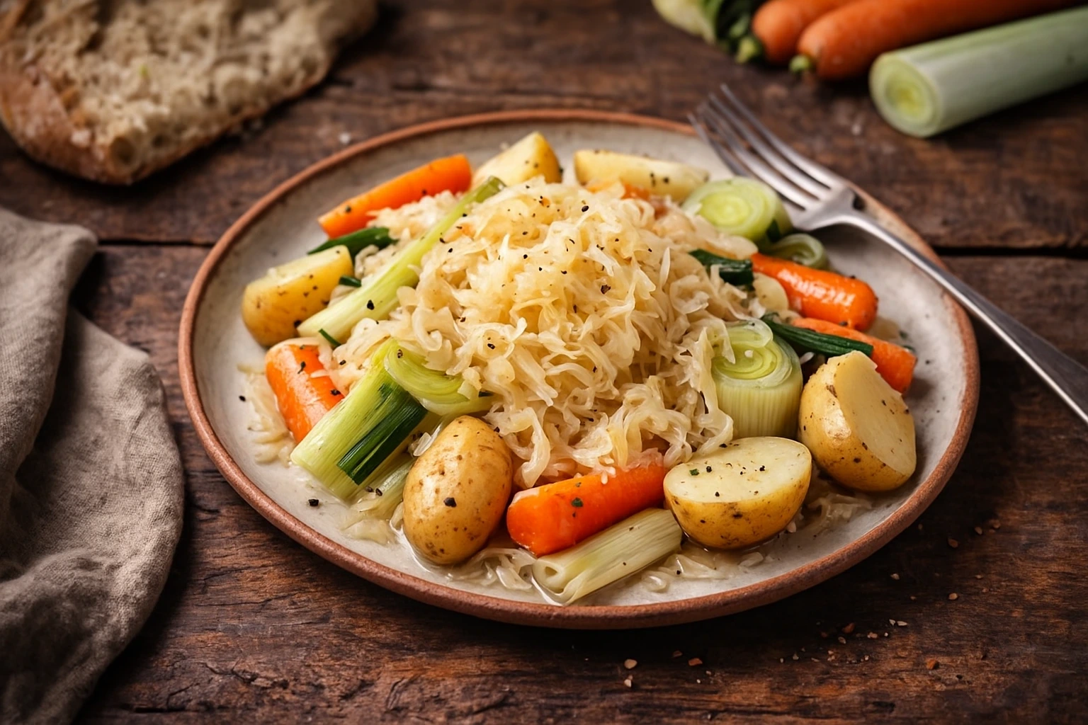 Les repas de fin d’année ont été riches… et votre ventre a peut-être besoin d’un petit coup de pouce ! La choucroute garnie aux légumes est idéale pour remettre votre système digestif sur pied tout en vous régalant. La choucroute fermentée apporte des probiotiques naturels, qui favorisent une digestion douce et un microbiote équilibré, et les légumes de saison apportent fibres et minéraux pour soutenir votre énergie après les fêtes.