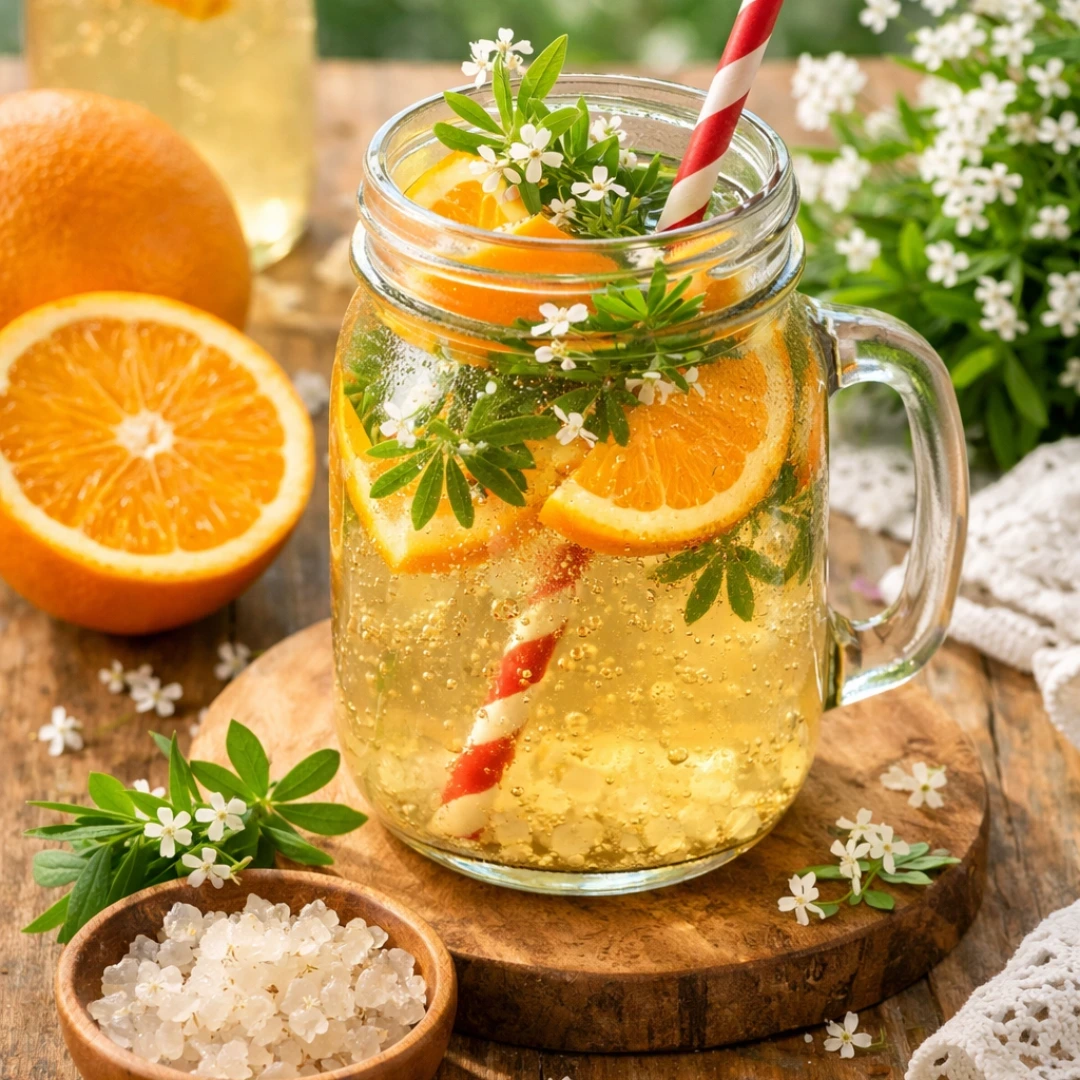 Ajoutez les brins d’aspérule et le jus de 1/2 orange.