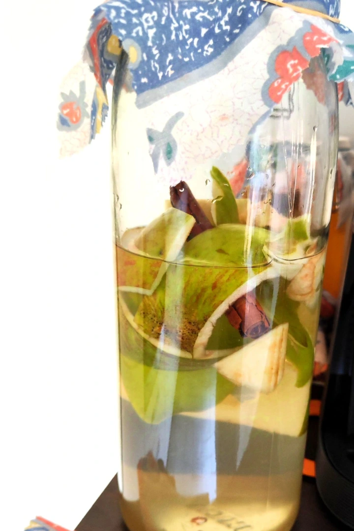 - Dans un bocal de 2 litres, déposez les épluchures et les trognons de pommes.